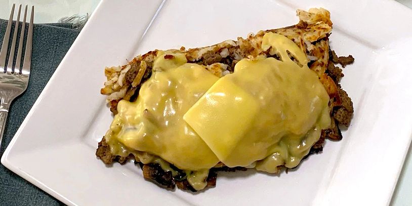 Melt the butter in 2 different sized skillet pans, on medium heat. Add the hash browns to the larger skillet, and add the sausage patty, mushrooms and spinach to a smaller skillet. Add onion powder, salt and pepper to both skillets. Cover both skillets and let them cook for 5-7 mins. Check on the hash browns, and see if the edges are turning brown. Wait for the spinach to wilt, then flip your hash brown over to brown the other side. Add the cheese slices, and cover. Go to your mushroom mixture, and shred the breakfast sausage and cut up the spinach. Uncover the hash browns, and add the mushroom mixture to one side of the hash browns. Flip the other side of the hash browns on top of the mushroom mixture. Slide all of it onto a plate and serve.